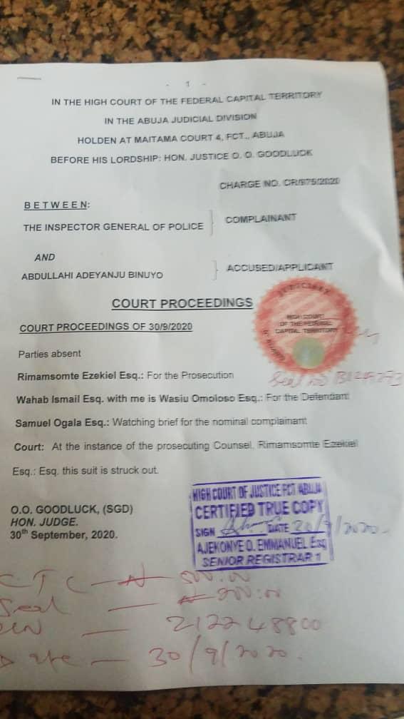 On Wednesday, 30 September, 2020, Hon Justice O. O. Goodluck of the High Court 4, Maitama struck out the case at the instance of the Prosecuting Counsel, Rumamsonte Ezekiel, Esq.