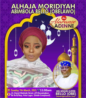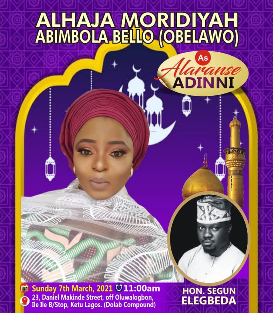 An Icon , Business woman , Philanthropist and a Role Model ALHAJA MORIDIYAH ABIMBOLA BELLO ( OBELAWO) set to be turbanned as Alaranse Adinni on Sunday 7th of March 2021 by 11a.m .