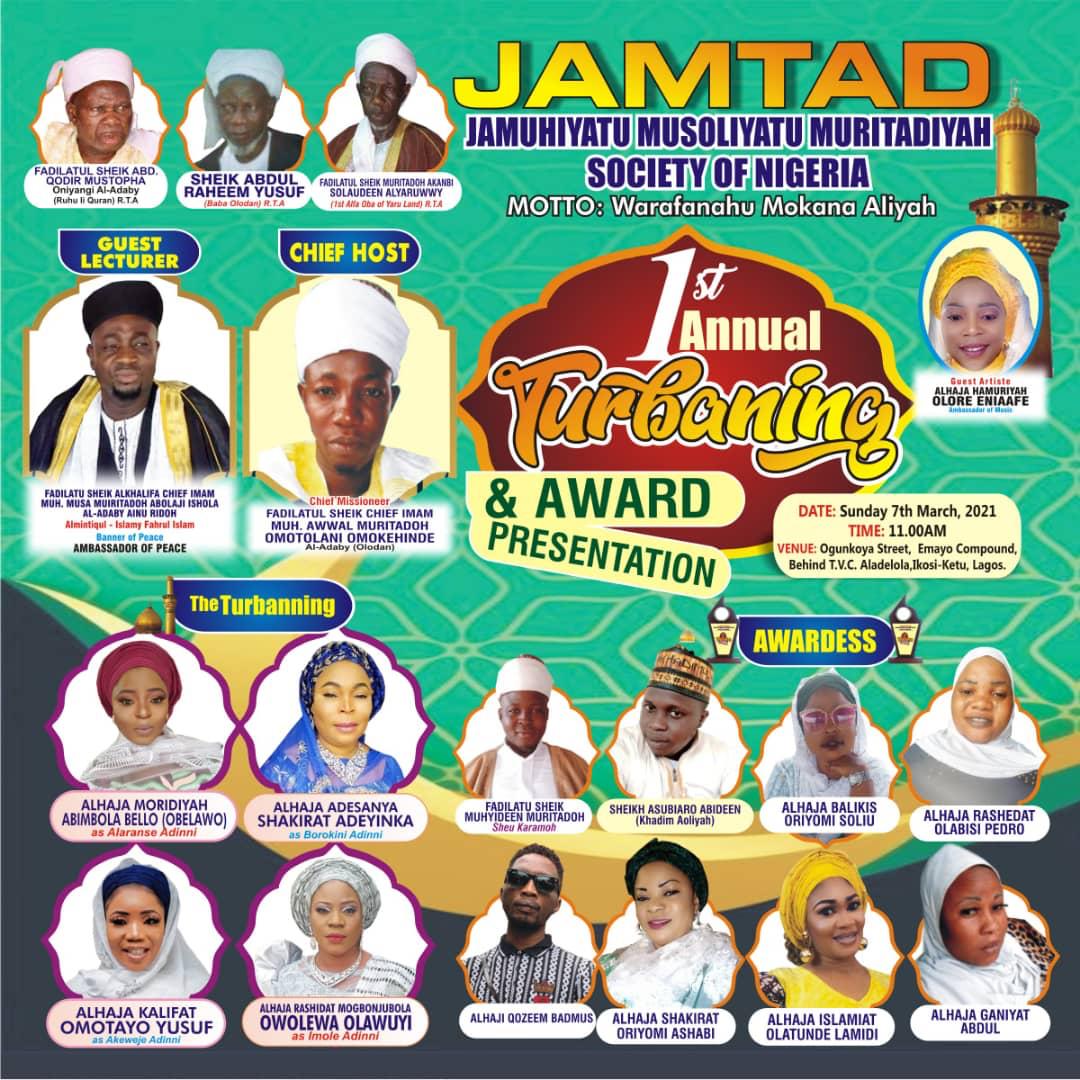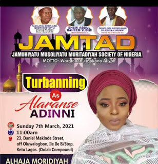 All Roads leads to Ketu on Sunday 7th of March as the JAMTAD , The Jamuhiyatu Musoliyatu Muritadiyah Society of Nigeria set for there 1st Tubarnning and Award Presentation day. The day Occasion is set to be a colourful one as one of the Dignitary set for the Turbaning is no other than ALHAJA MORIDIYAH ABIMBOLA BELLO (OBELAWO)