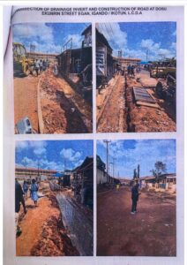 In Abaranje-Okerube, Ward B, infrastructure projects focused on road and erosion control, focusing on the construction of drainage and erosion control at Osunba Street/Joshua Ogunaike Street off Igando-Ikotun Road.