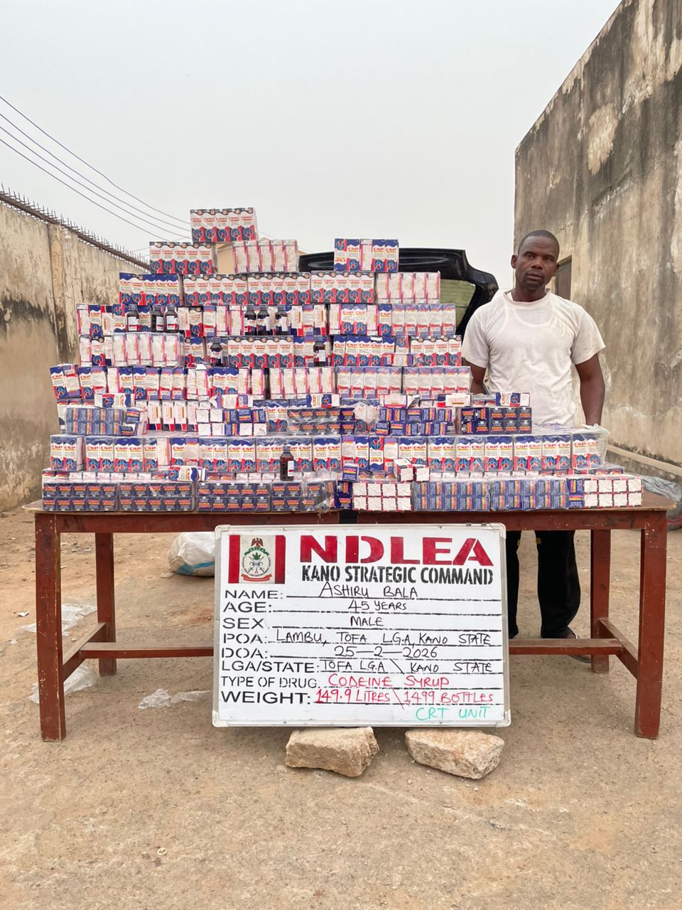 A suspect, Ashiru Bala, 45, was arrested with 1,499 bottles of codeine syrup at Lambu, Tafa LGA, Kano state on Wednesday 25th February while conveying the consignment in his Volkswagen Golf car marked CA 911 ABC. Another suspect Yahaya Usaini, 21, was nabbed on Friday 27th February while transporting 87.4 kilograms of skunk in a Toyota Hiace bus with registration number KUJ 544 RL along Zaria- Dutsinma road, Katsina state.
